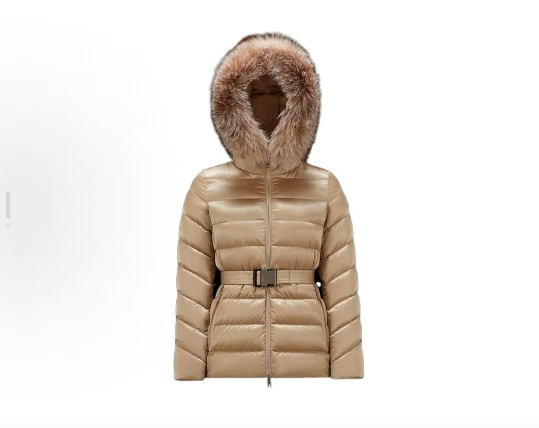 Moncler FW23 단색 화이트 구스다운 허리 축소 후드 지퍼 패딩 여성 라이트 브라운